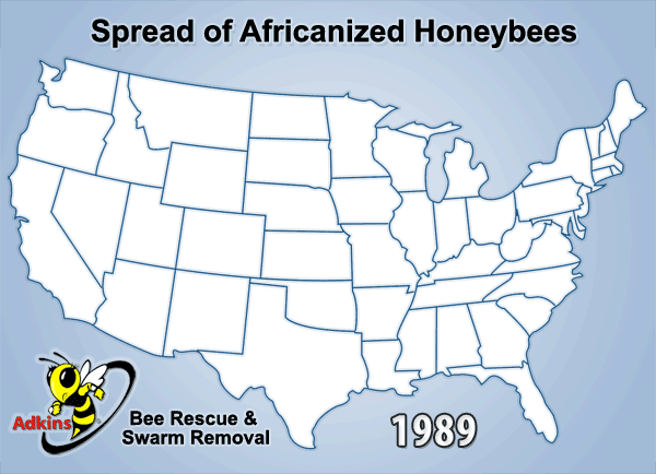 The map below shows the migration of the Africanized Honeybee year by year as reported by each State having first arrived to Texas in 1990. You can also view the reported Africanized honeybee (AHB) spread from South America starting from 1957 forward.